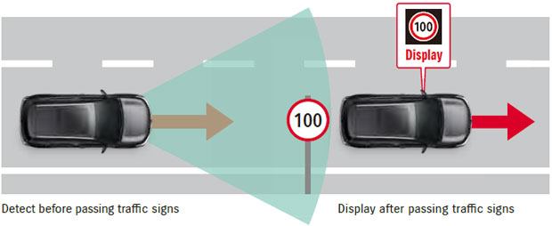 Funcția folosește sistemul DSBS pentru a detecta și recunoaște semne de circulație, inclusiv limite de viteză, indicatoare de acces interzis și semne auxiliare. Mai mult, o ilustrare grafică a fiecărui semn este afișată, după caz, pe instrumentarul de bord, pentru a-i reaminti șoferului când intră în zona de incidență a respectivului semn de circulație. Sistemul poate reda până la 3 semne de circulație simultan.