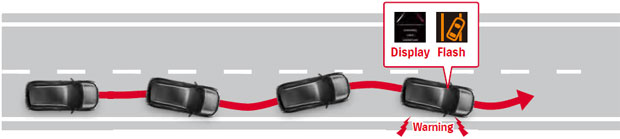 La viteze de peste 60 km/h, camera monoculară detectează mișcările stânga-dreapta în interiorul benzii de circulație cauzate de lipsa de atenție sau de oboseală și notifică șoferul cu semnale vizuale și auditive.